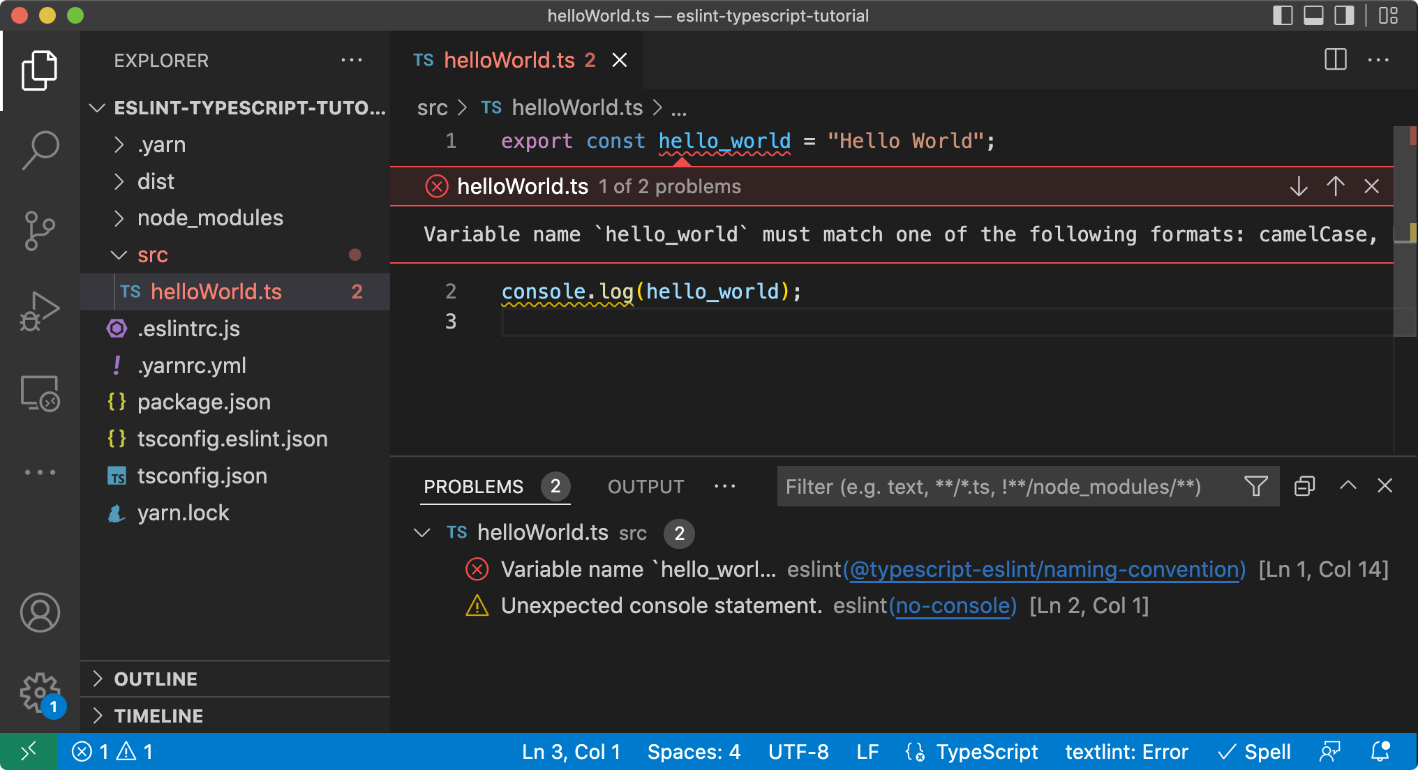 src/helloWorld.tsを作成し、コンパイルしてみました。 - ESLintとTypeScript ESLintをインストールしました。